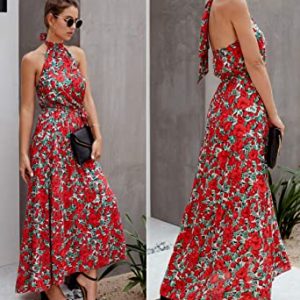 PRETTYGARDEN Women’s Casual Halter Neck Sleeveless Floral Long Maxi Dress Backless Loose Ruffle Sundress with Belt